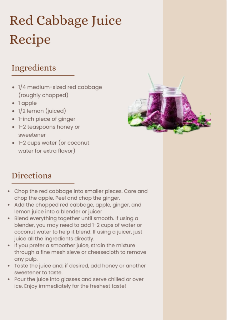 To get the most out of your red cabbage juice, serve it fresh and chilled. For added flavor and nutrition, mix it with complementary ingredients such as lemon juice, green apple, or a touch of honey. If you’re serving it in the morning, pair it with a light breakfast like avocado toast or a smoothie bowl. For an afternoon pick-me-up, enjoy it over ice with a sprig of mint or a dash of cayenne for an extra kick.